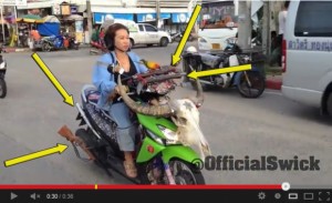 Offensichtlich scheint es in Thailand keinen TÜV zu geben. Anders ist es nicht zu erklären, dass die Dame im Video ein mit Stierschädel und mehreren Waffen verziertes Bike durch den Verkehr lenkt. Man achte ebenfalls auf den kleinen Vogel, der die Frau begleitet und sich dann auf den Lenker setzt. Andere Länder, andere Sitten…