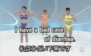 Kein Witz, sondern ein alltägliches Beispiel der japanischen Fernsehkultur liefert der folgende Clip, bei dem die Protagonistinnen sinnlose englische Phrasen wie “Ich habe schlimmen Durchfall” vor sich hinplappern. Offensichtlich der Versuch, Sport und Englischlernen miteinander zu verbinden. Herausgekommen ist dabei allerdings eher Comedy…