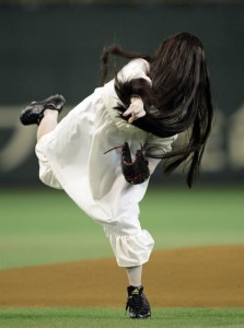 Am 12. Mai startet in Japan der nächste Teil der „Ring“-Reihe, der sich „Sadako 3D“ nennt und natürlich umfassende Promotion-Maßnahmen mit sich zieht. Eine davon hat sich im Sapporo Dome, dem Heim des Baseball-Teams der Nippon Ham Fighters (die heißen wirklich so) beim Spiel gegen die Chiba Lotte Marines zugetragen. Traditionell gebührt der erste Wurf eines Spiels einem Ehrengast, der sich diesmal als… Sadako persönlich entpuppte! Skurril!